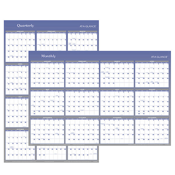 Keep up with your busy schedule with this At-A-Glance A1152 32" x 48" blue / gray reversible vertical / horizontal erasable January 2026 - December 2026 wall planner. Featuring a write-on / wipe-off surface, this wall planner is the perfect way to stay on track with frequently changing plans and appointments. Thanks to the versatile horizontal or vertical annual view, you can position this planner on your wall to best fit your work space.