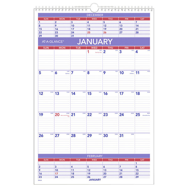Keep track of important dates with the help of this At-A-Glance PM628 15 1/2" x 22 3/4" 3-month reference January 2026 - December 2026 wirebound wall calendar! This calendar features 3 months per page, providing ample room for you to see meetings and events for the upcoming weeks. The ruled daily blocks allow you to include notes and appointments in an organized manner. It also highlights federal holidays for your convenience.
