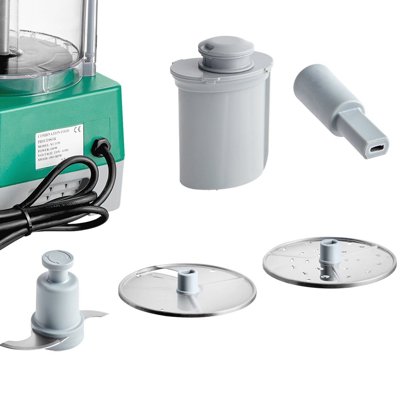 This unit comes with a 5/32" slicing disc, 5/64" grating / shredding disc, and "S" blade for optimal versatility. The included pusher has a removable inner pusher, which is great for processing smaller or slender product such as celery stalks. It's also perfect for small-batch pureeing, chopping, emulsifying, slicing, and grating. A stem extender is included to allow for continuous food processing directly into the bowl when used with the slicing or grating discs.