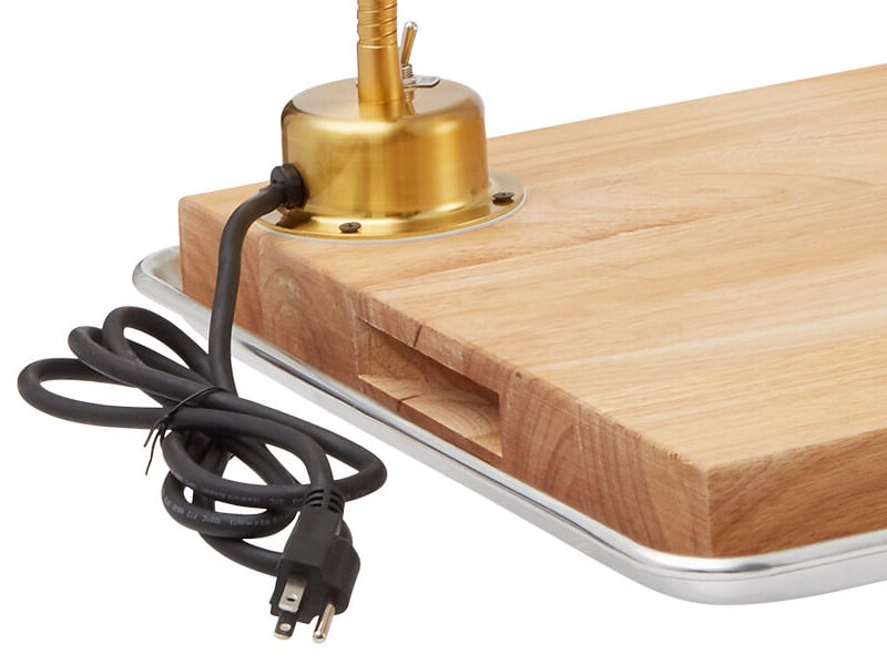 The carving station kit has an on / off switch that's located away from the heat zone for increased safety. It also sports a lengthy cord for optimal positioning.
