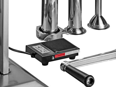 The motor also includes a foot pedal, allowing the operator to focus on forming the sausage and eliminating the need to manually operate the unit. This hands-free design promotes sanitation, which is especially important in a kitchen that works with raw meats.