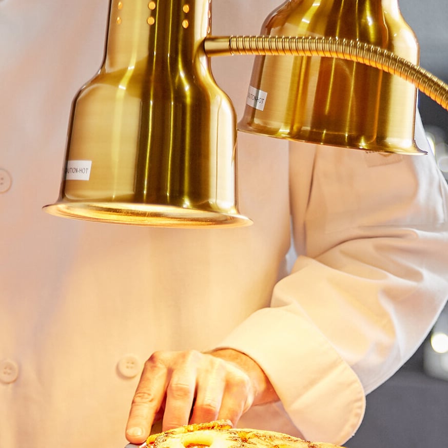 This dual-arm lamp is great for use with carving stations at hotels, banquet halls, or catered events. It gives you a range of heating options thanks to its flexible body that may be lowered toward, or raised away from foods with ease. Two separate arms allow for complete coverage! They also provide a clear view of what you're doing, which helps to ensure precise cuts when working on your delicious meats and other product.