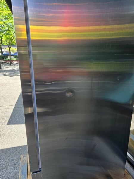 The unit arrived covered entirely in cardboard, plastic and stryrofoam. I signed for it because there was no damage whatsoever to any of the packaging. After unwrapping the multiple layers of packing...I found several large dents in very noticeable areas all around it. This could only mean that the fridge was dented BEFORE it was wrapped! Completely unacceptable. Now, I'm stuck with a brand new heavily-dented fridge that I cannot return to the carrier since we signed for it. I am so frustrated that I paid good money for a brand new fridge and it looks like crap! Not the first time I have received a faulty brand new Avantco fridge either. This will be my last Avantco product I ever order! The fridge works okay, but there is a massive interior fan that takes up 8 inches of space all the way across the top.
