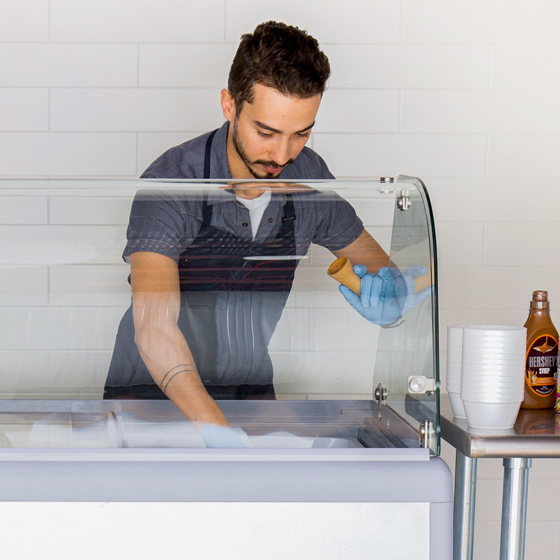 Outfitted with a curved-front sneeze guard, the dipping cabinet is perfect for front-of-house applications. Not only does the sneeze guard prevent customers from contaminating the product, but it ensures crystal-clear visibility for merchandising purposes.