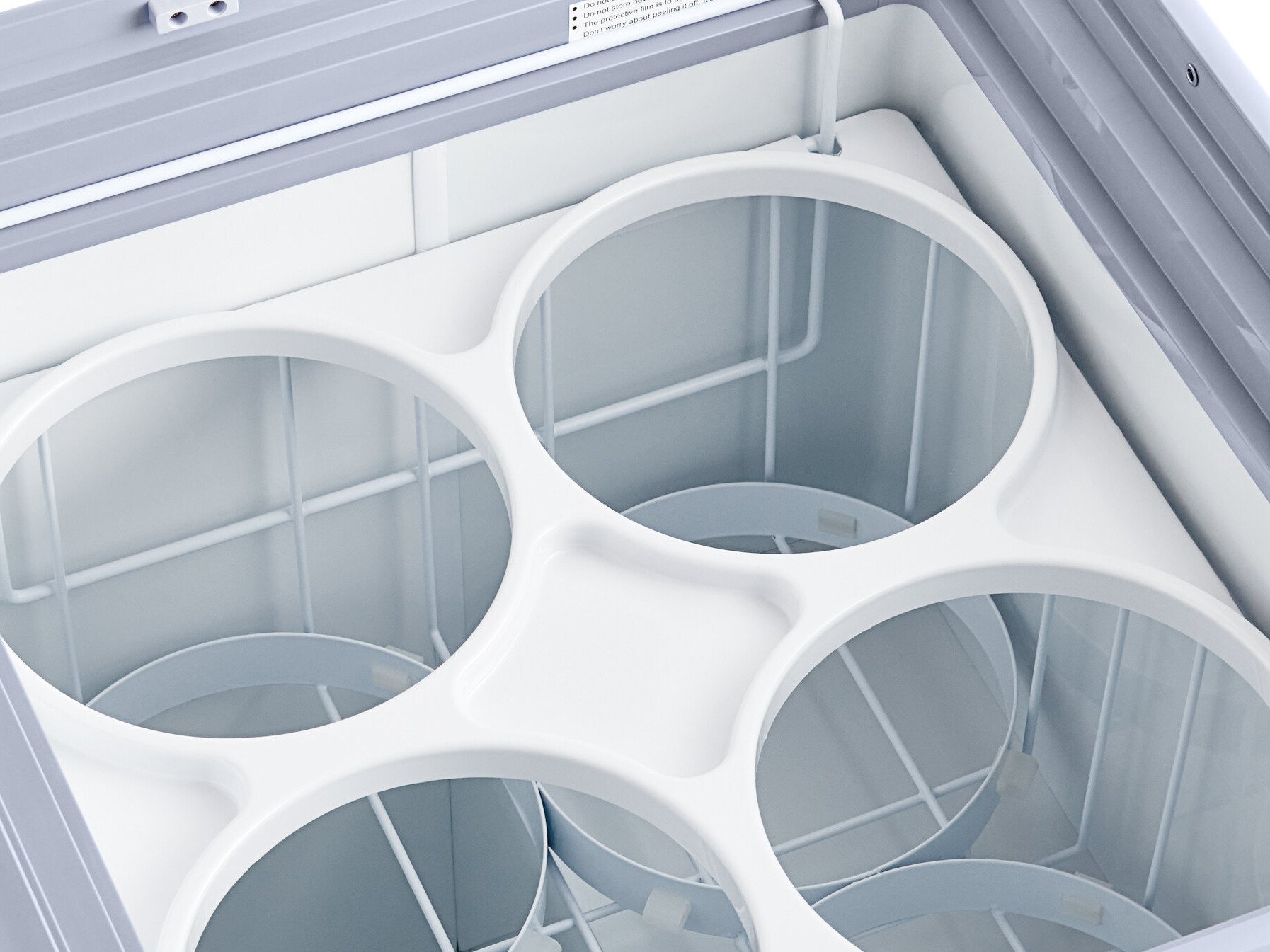 Holding up to (4) 10" x 10" 3-gallon ice cream tubs (sold separately) at a time, the unit is perfect for ice cream shops, candy stores, dessert bars, and cafeterias. This cabinet features a white curved-front design with a painted steel construction. The frozen storage space beneath the display even provides a convenient place for holding up to 2 backup flavors, making it a space-efficient unit for businesses with limited space.