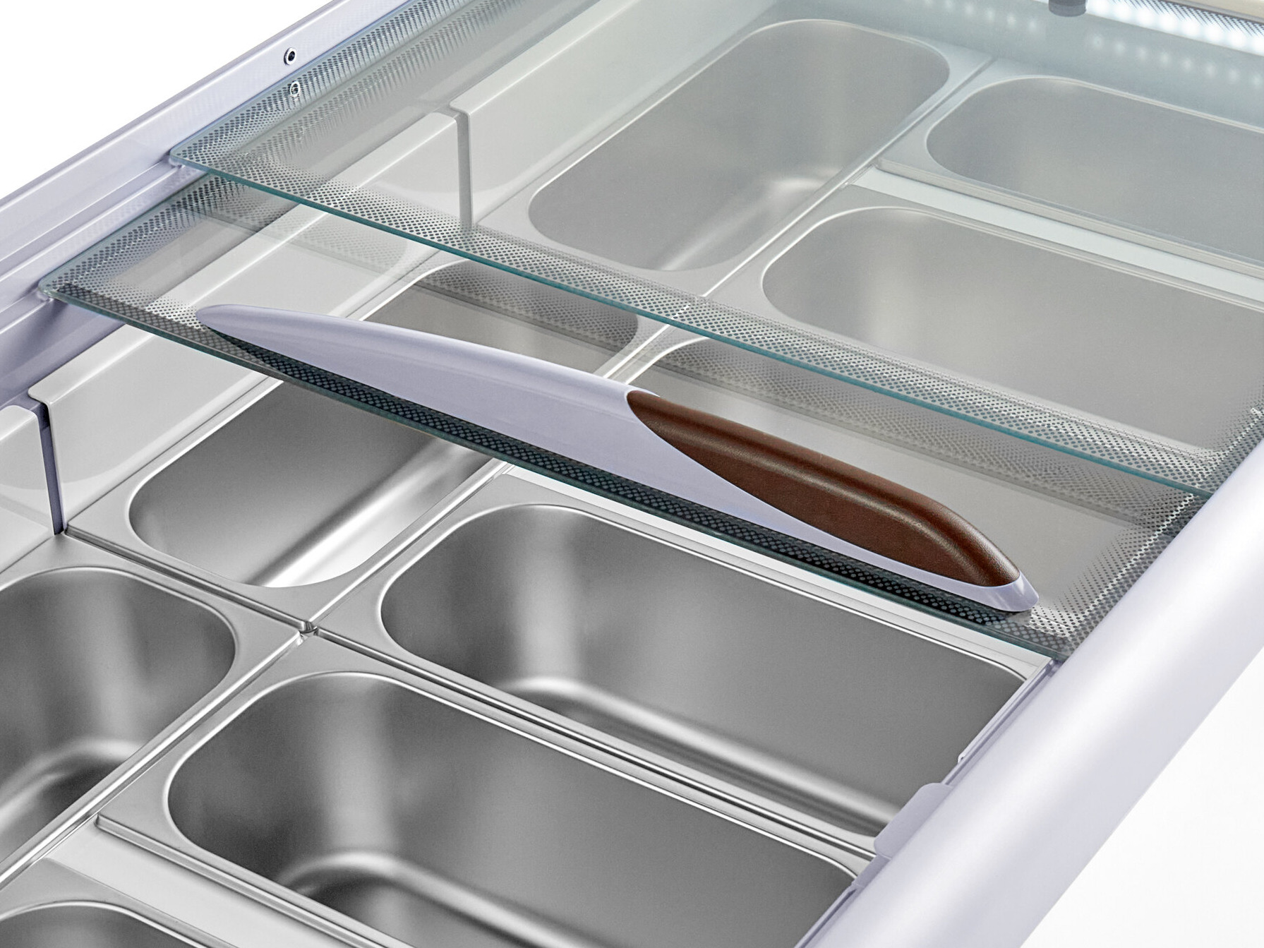 A sliding cover protects your product while helping to retain cold air around the product for a safe holding environment. Because it slides open and closed, it's fast and easy to use, too, which is perfect for those busy rush hours or constant streams of customers in the summer months! The cover also comes equipped with a lid lock to ensure that your ice cream remains protected and temperature controlled.