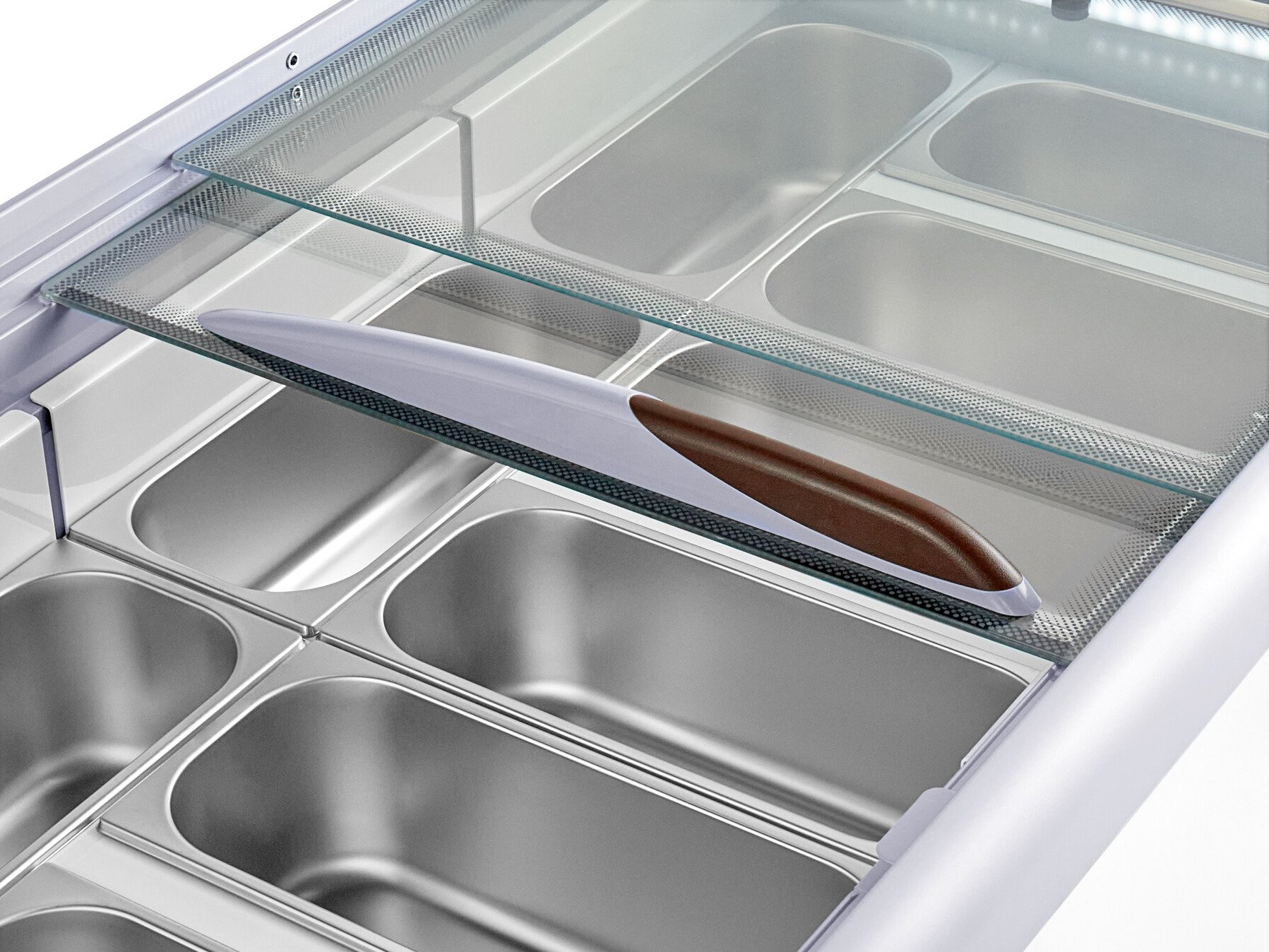 The frozen storage space beneath the display even provides a convenient place for holding back-up pans, making it a space-efficient unit for businesses with limited space.