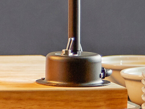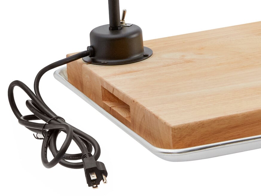 The carving station kit has an on / off switch that's located away from the heat zone for increased safety. It also sports a lengthy cord for optimal positioning.