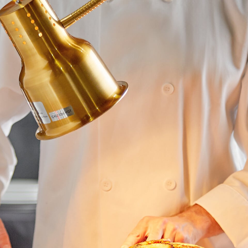This lamp is great for use with carving stations at hotels, banquet halls, or catered events. It gives you a range of heating options thanks to its flexible body that may be lowered toward, or raised away from foods with ease. It also provides a clear view of what you're doing, which helps to ensure precise cuts when working on your delicious meats and other product.