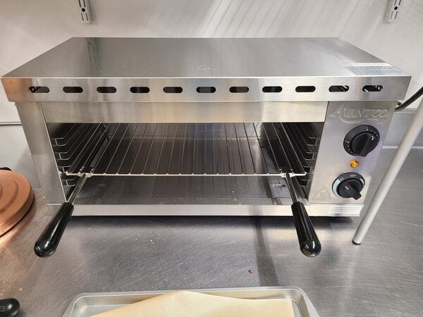 We use this in a small diner to melt shredded cheese on fries. It gives a nice even melt with light browning and keeps fries crisp. It heats up fairly quick, we usually set it on high for about 3-5 minutes and its ready to go, then we give the cheese fries 1-2 minutes to melt before serving. Overall a nice addition and worth the price.