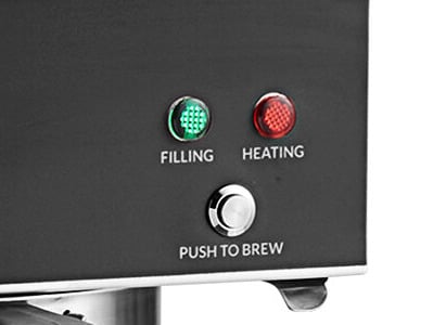 Toggle switches allow for simple brewing and warming of coffee, while lights show when the unit is brewing or preparing to brew.