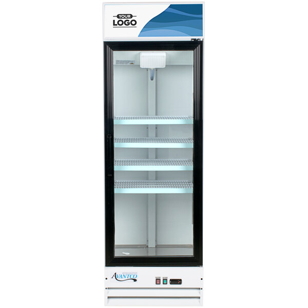 - Item #: 178gdc15wcAvantco GDC-15-HC 25 5/8" White Swing Glass Door Merchandiser Refrigerator with LED Lighting and Customizable Panel