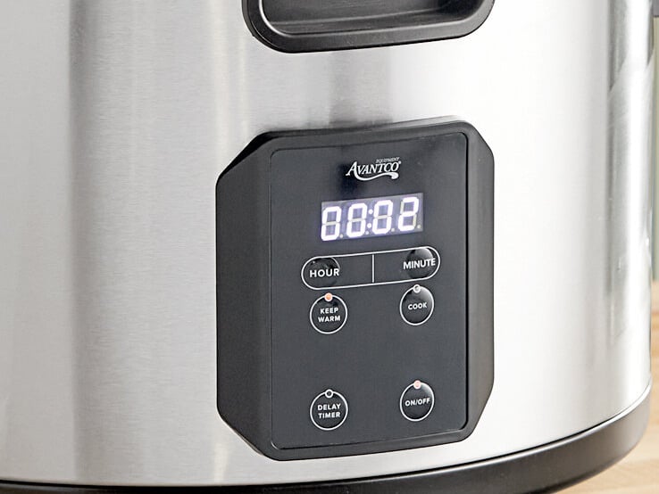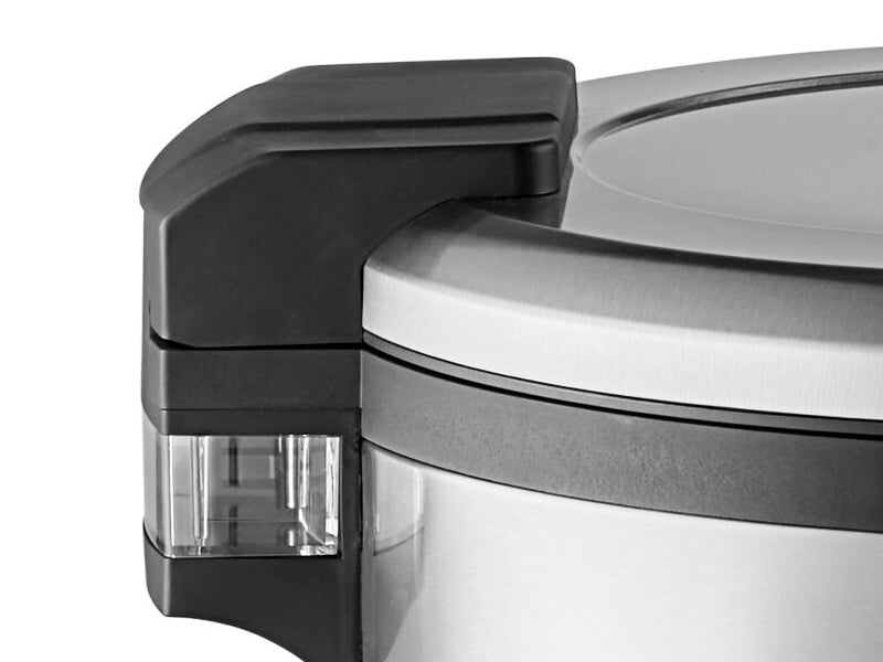 The easy-to-use control panel features user-friendly buttons with indicator lights to show whether the cooker is in cook or warm mode. The lid features a carry handle that can make moving the unit even easier. Plus, its tightly sealed hinged lid locks into place and has a button release.