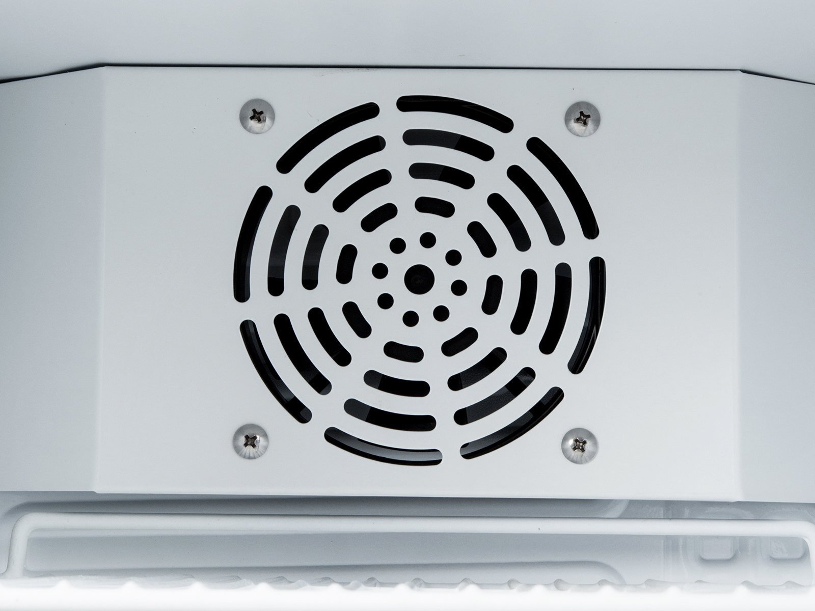 A fan within the cabinet circulates the air for even distribution, aiding in temperature maintenance and food preservation.