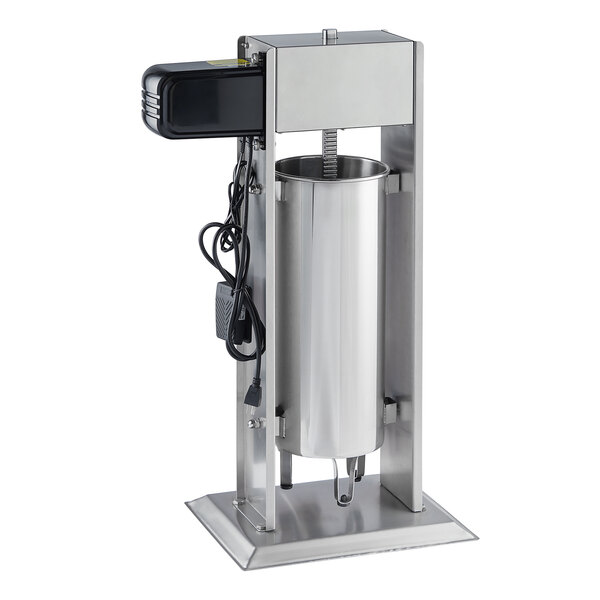 Type 201 stainless steel sides and a removable type 304 stainless steel tilt-out canister ensure long-lasting durability as well as quick and simple cleaning. This sausage stuffer features large rubber feet and a heavy base to help prevent rocking during use. Add this rugged, large-capacity sausage stuffer to your commercial kitchen or butcher shop to expand your sausage selection! This unit requires a 120V electrical connection for operation as an electric stuffer.