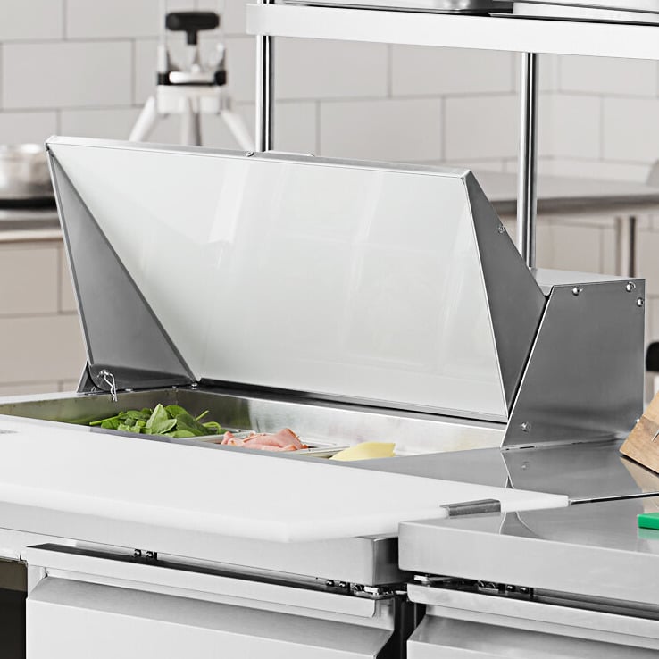 Its top accommodates up to (8) 1/6 size food pans up to 6" deep (sold separately). These are great for holding common sandwich or salad toppings, from eggs and cheese to green pepper or ham. Plus, a lift-up lid encloses the top to maintain proper, food-safe temperatures.