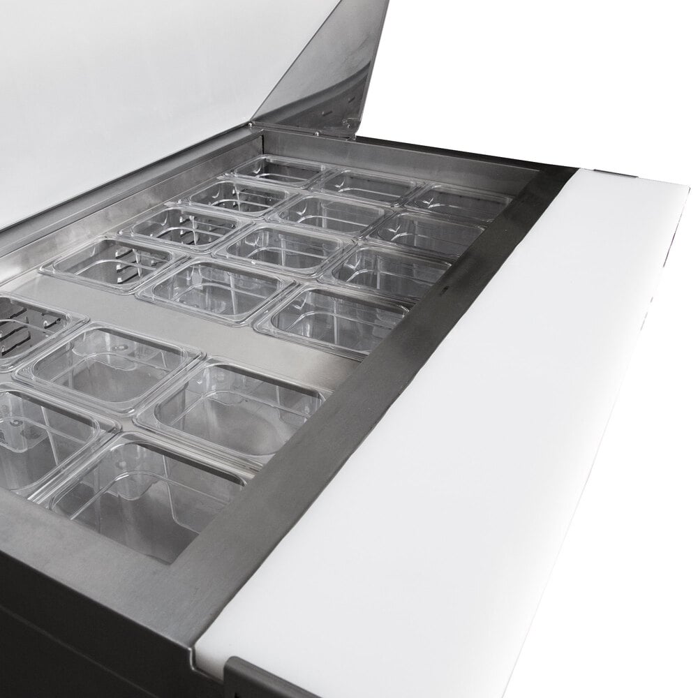 This unit's top accommodates up to (18) 1/6 size food pans up to 6" deep (sold separately). These are great for holding common sandwich or salad toppings, from eggs and cheese to green pepper or ham. A liner catches any ingredients that may fall between the pans, preventing them from falling within the cabinet and making cleanup a breeze! Divider bars are also included for ultimate convenience.