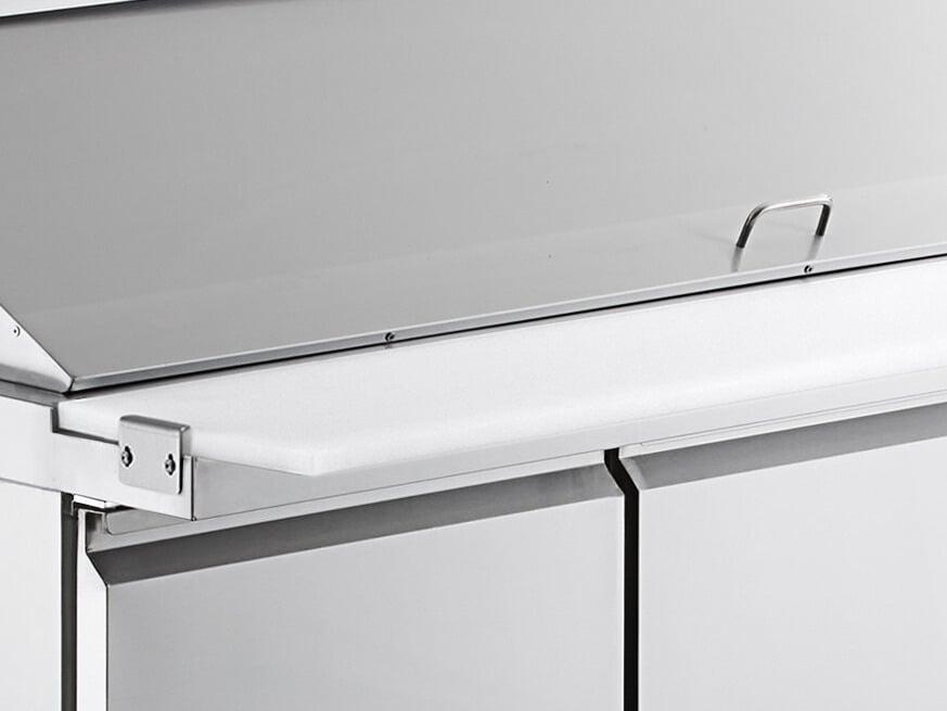 An 11 1/2" deep cutting board is mounted to the table surface as a place for slicing ingredients and assembling orders. This mega top, industry-best cutting board is removable for easy cleaning at the end of the day.