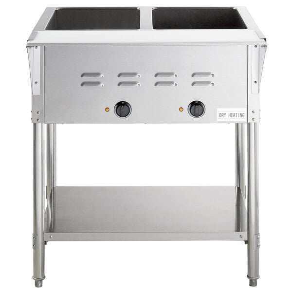 This steam table can be used for dry or moist heat holding. Simply fill a compatible spillage pan (sold separately) with hot water and place your hotel pan (sold separately) inside for moist heat holding. For dry heat holding, place a full-size hotel pan (sold separately) directly into the well (no water necessary). Only full-size pans can be used for dry heat holding; fraction pans are not recommended. This design provides flexibility, allowing you to use dry and moist heat simultaneously.