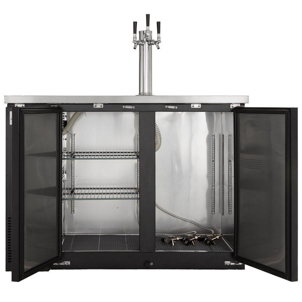 It holds (2) 1/2 kegs so you can stock up on one brew or offer customers a selection to choose from, and it even comes with 2 shelves for optional bottle or can storage while concealing the product behind 2 solid doors. The doors themselves are not only self-closing to prevent potential energy loss, but also lock to prevent theft during off hours. This unit is equipped with knockout plugs to install external CO2 lines.