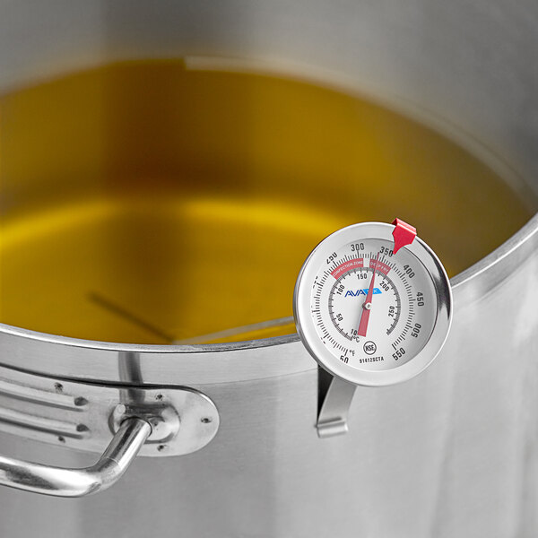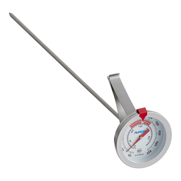 The 12" long stainless steel stem includes a pan clip so that mounting the thermometer is easy and reliable, keeping it in place as you work for hands free use. Plus, it includes guidelines for measuring candy or fry oil temperature right on the dial.