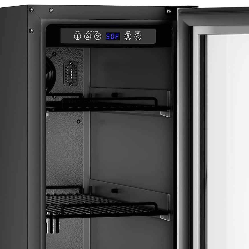 Featuring a single-zone temperature range, this beverage cooler is the perfect way to keep your drinks chilled and ready to serve. This fridge boasts a temperature range from 34 to 50 degrees Fahrenheit and features a full glass door that displays your beverages for customers to see as well as 4 adjustable wire shelves for a capacity of up to 52 cans. With a convenient design and versatile storage, this unit is a must-have in your busy establishment.