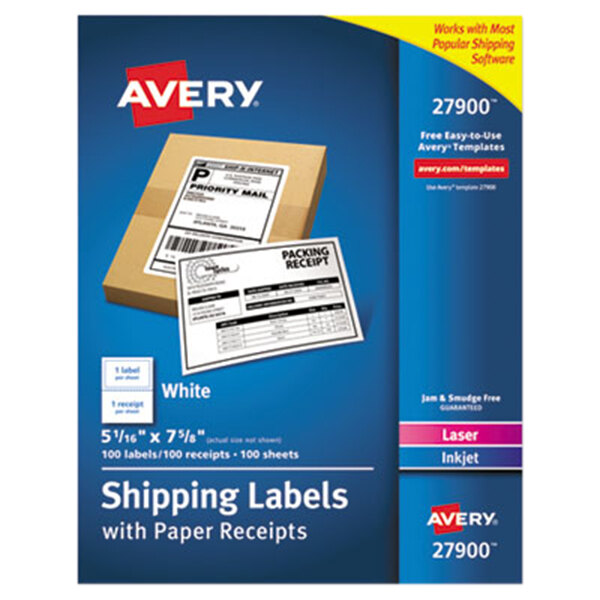 Create your own custom shipping labels with the Avery® 27900 5 1/16" x 7 5/8" white rectangular shipping labels with paper receipts. Featuring an efficient design that combines the shipping label and paper receipt onto one sheet, this set of labels will help streamline your work process. Thanks to the perforations, you can also easily separate the shipping label and receipt so you can work quickly to apply labels.