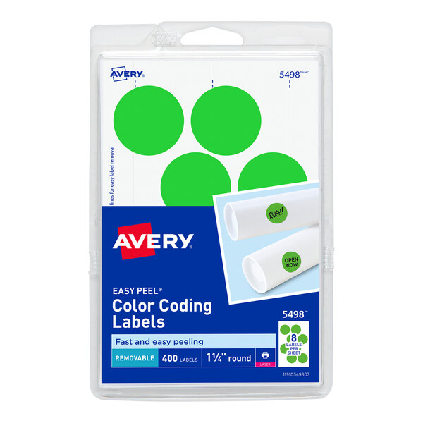 Color code documents, files, and folders with the Avery® 5498 1 1/4" neon green round removable write-on / printable labels. Boasting a small 1 1/4" diameter, this label is perfect for keeping track of inventory and creating a pricing system on your merchandise. Great for classrooms, merchandise counters, and mailrooms, this label is a versatile addition to your office supplies. Thanks to the write-on / printable design you can quickly hand write names and dates right on the label or print your text using a laser or inkjet printer for a more professional look.