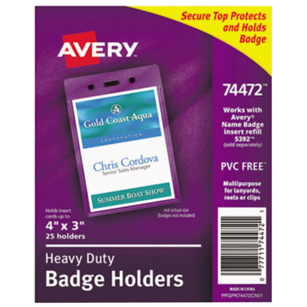 Easily keep track of guests, students, employees, or conference attendees by providing them with this Avery® 74472 4" x 3" clear vertical secure top heavy-duty badge holder! Its clear design ensures constant badge visibility to make reading names and networking as easy as possible. Plus, thanks to its heavyweight plastic, badges are durable enough to withstand daily use and economical enough to use in place of flimsy, adhesive nametags.