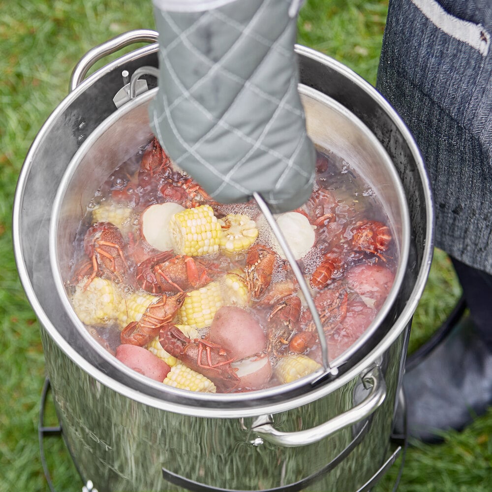 - Heavy-duty 50 qt. stainless steel pot is perfect for preparing a seafood boil