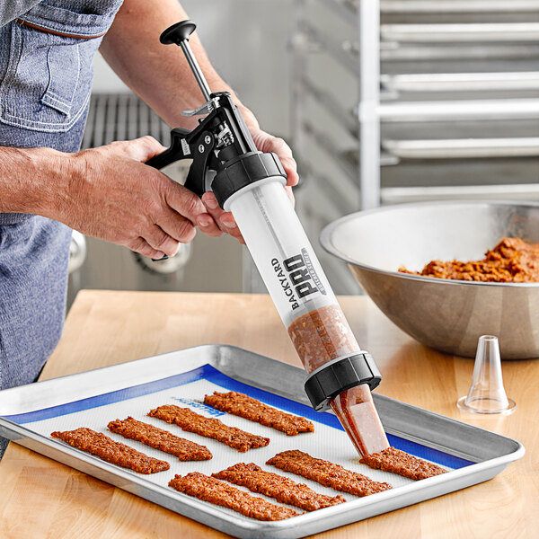 Whether you're making sweet and spicy snack sticks or savory black pepper jerky, this Backyard Pro Butcher Series 3/4 lb. jerky shooter will have you pumping out both with the simple squeeze of a trigger! Sporting a simple construction, durable build, and two nozzle attachments, this jerky shooter will fit right into delis, grocery stores, and other foodservice establishments.