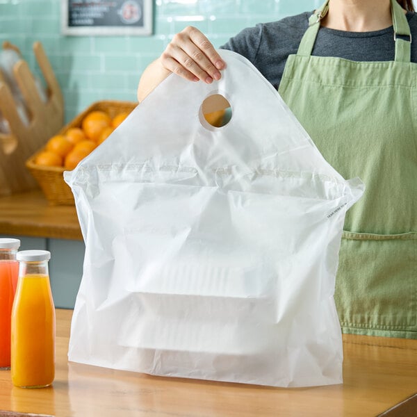 Streamline your takeout service with this Choice 21" x 10" x 20" standard-duty white unprinted tamper-evident plastic wavetop bag! This unprinted white bag will integrate seamlessly with your food packaging for a clean and professional presentation. The wavetop design of the bag includes integrated handles and a flat bottom, making it the perfect solution for bagging orders on the go. It also features a tamper-evident adhesive strip, allowing you to seal the bag closure and provide your customers with peace of mind knowing that their carryout and delivery orders have not been tampered with. With the ability to hold 3-4 to-go containers up to 10 1/2" wide, this bag is ideal for accommodating a variety of entrees, salads, and sides.