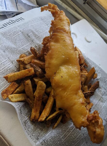 Serve your famous fish and chips in Bagcraft Packaging's 16" x 12" newsprint deli sandwich wrap paper.