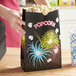 Get the party popping by serving warm and salty popcorn in this Bagcraft Packaging 300451 7 1/2" x 3 1/2" x 11 7/10" Funburst popcorn bag. Bursting popcorn kernels resemble neon fireworks on this black bag, adding festive color to your presentation. The grease proof, two-ply paper keeps the butter from seeping onto your customers' hands. Entertain your guests at your next fair or theater event by using this 170 oz. economical and sustainable alternative to cartons and tubs.