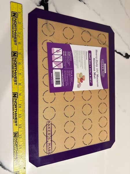 Template mat for making macarons. Excellent choice to make smaller cookies. Purple color edge stand out if you are baking allergy free.