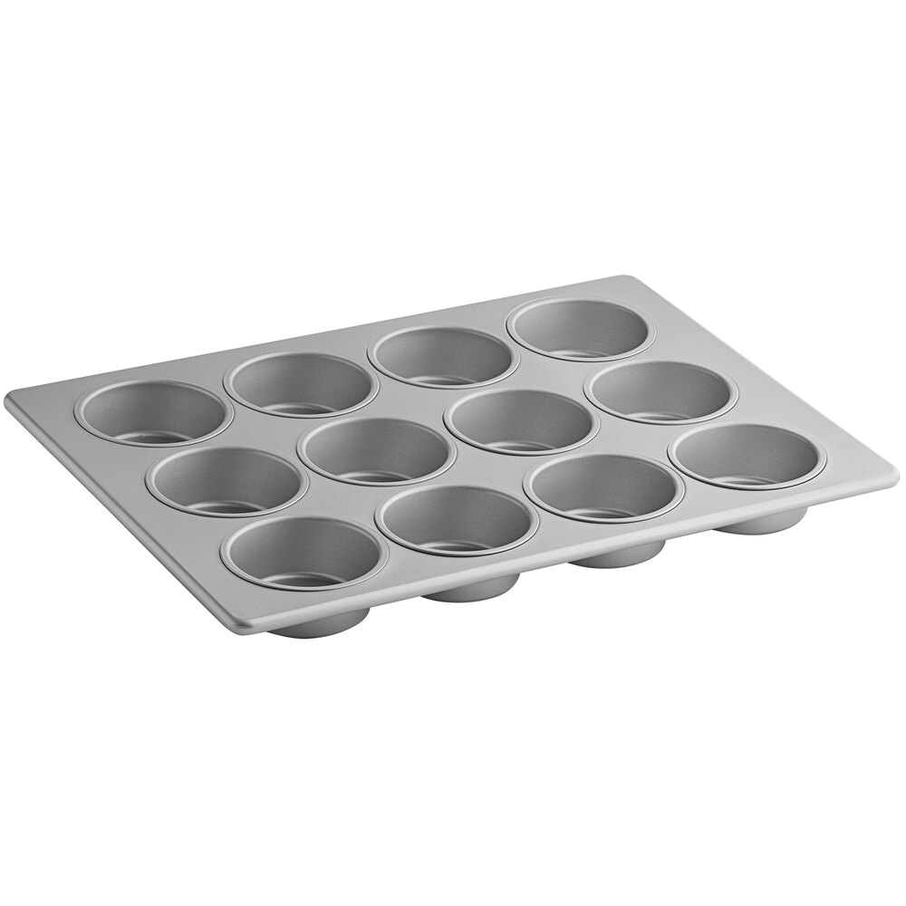 These pans are AMAZING! Heavy duty and VERY durable. I never have problems with baked batter sticking to the pans. It simply wipes off. I use this pan with the 2 1/4"X1 7/8" baking cups(#999610070) and they work PERFECT!! REMEMBER: These muffins are almost twice the size of the standard cupcake so I recommend ordering the "cake tester" (#1441445) to make sure your muffins come out perfect. Great quality at a great price! Couldn't ask for better. :)