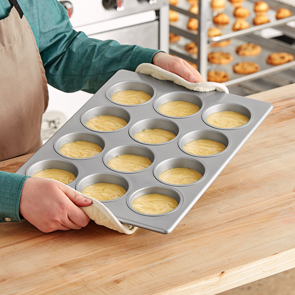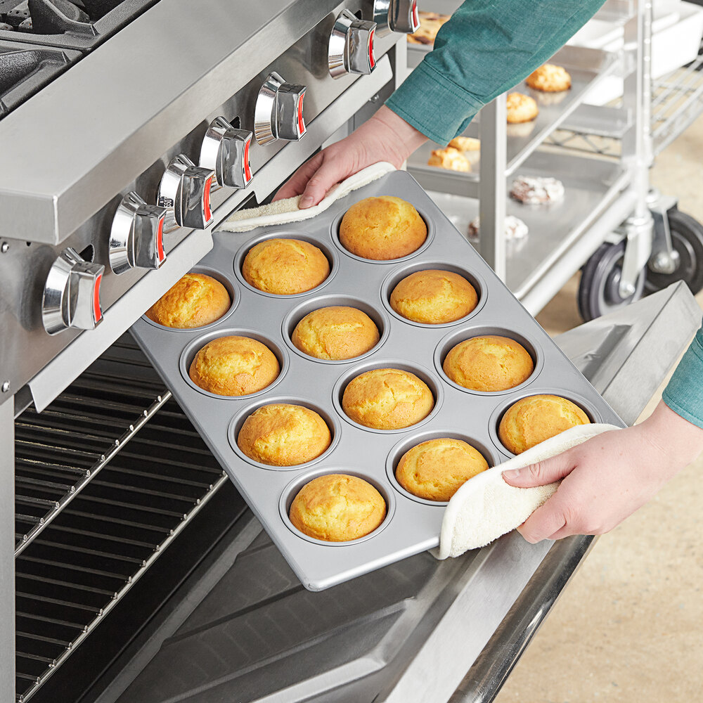 This pan has a durable 24 gauge thickness that is built to be a lasting addition to your business. Perfect for your bakery or catering operation, try this aluminized steel muffin pan!