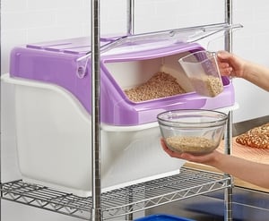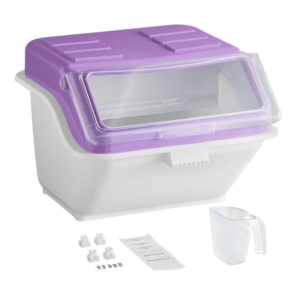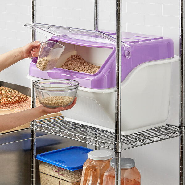 This ingredient bin features a purple lid which identifies allergen-free ingredients, making it easy to maintain health codes and honor guests' dietary requirements.
