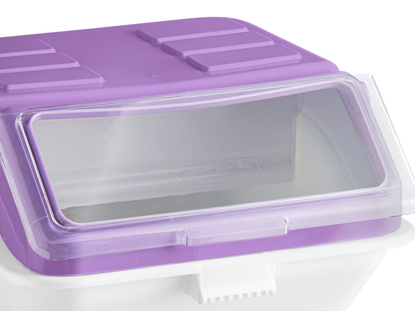This ingredient bin features a purple lid which identifies allergen-free ingredients, making it easy to maintain health codes and honor guests' dietary requirements.