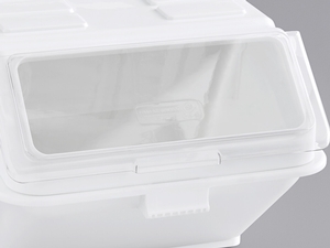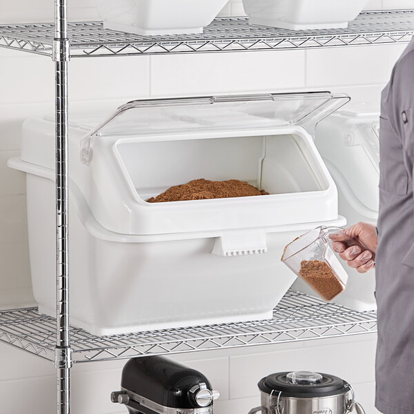 Perfect size for 25lb gran sugar, we use this everyday. Sturdy, cover fits tightly and it’s so convenient. Fits on the stainless table under-shelf perfectly.