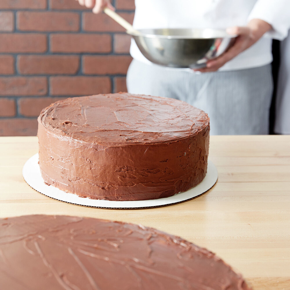 Featuring a wax-coated white side and an uncoated kraft side, this cake circle has a grease-resistant finish that is designed to prevent stains, moisture marks, and residue from transferring onto the board from your buttercream frosting, glazes, or chocolate syrups. It provides a crisp, clean border to your cakes while ensuring a professional presentation for your most elegant of occasions. Plus, you can wipe off any excess icing with ease.