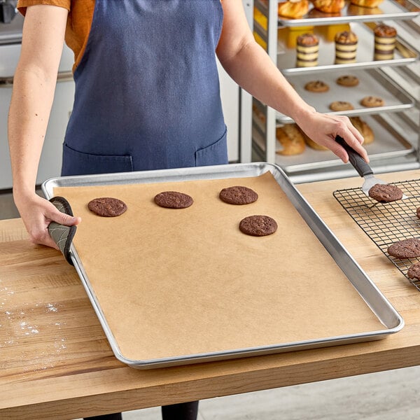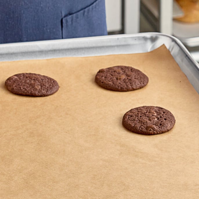 This full size unbleached silicone coated parchment paper bun / sheet pan liner sheet is extremely durable and can handle up to 440 degrees Fahrenheit to accommodate your various baking needs. It can even be used to make disposable pastry bags, bake foods en papillote, or season foods in a parchment-made envelope. Because this sheet liner protects your pan from grease buildup, a limited amount of water is required for washing, ultimately making your pan remarkably easy and quick to clean.