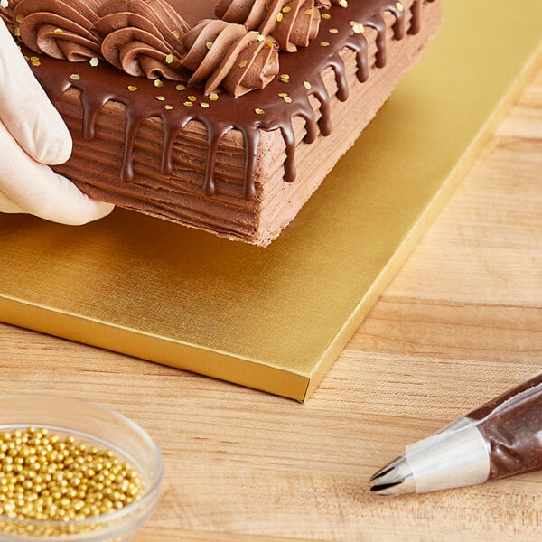 Featuring an elegant gold foil-wrapped design, this cake drum adds an aesthetic touch to your dessert presentations. This makes it an ideal choice for showcasing your culinary masterpieces at any bakery, grocery store, or market.