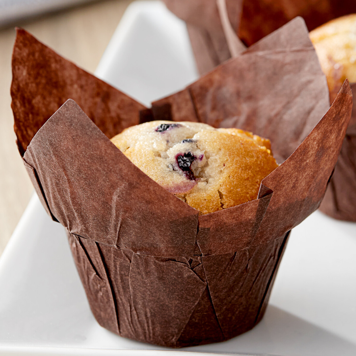 This muffin wrap features an attractive chocolate brown color and a high crown design that provides extra space and a beautiful presentation. It's ideal for baking muffins and cupcakes!