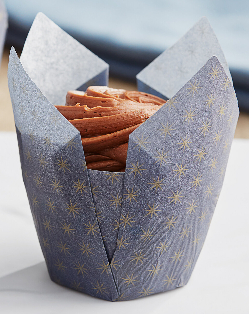 This tulip baking cup features an attractive chorus blue and gold print and a floral design that resembles tulip petals for a beautiful presentation in any setting. It's ideal for baking muffins and cupcakes!