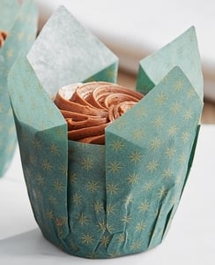 This tulip baking cup features an attractive chorus green and gold print and a floral design that resembles tulip petals for a beautiful presentation in any setting. It's ideal for baking muffins and cupcakes!