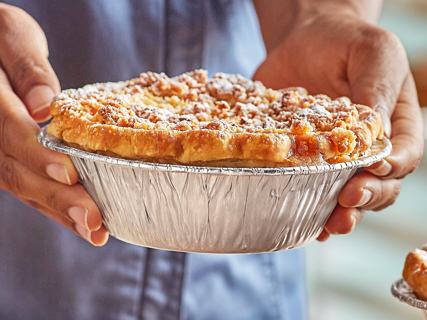 This foil pie pan features a full curl rim to aid in crust formation and provide support, making the pie easier to serve.