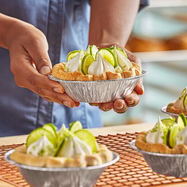 Made of heavy-duty aluminum foil, this pan allows for excellent heat retention and distribution for perfectly crispy pie crusts. It features a 7 oz. capacity and 1 1/4" depth, which creates extra space for more pie filling.