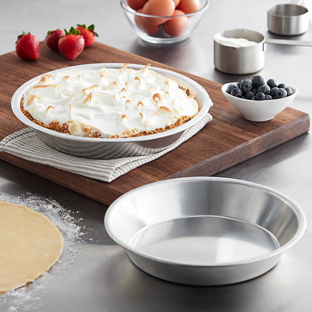 This sturdy 16 gauge aluminum pie pan provides the extra strength and durability that every great kitchen needs. It works well for baking and storing your guests' favorite pies, from apple crumb to blueberry to delicious pumpkin pie! This reusable pan is designed for long-lasting use and is strong enough to stand up to daily wear and tear. Your kitchen will move quickly and efficiently with this convenient pie pan!