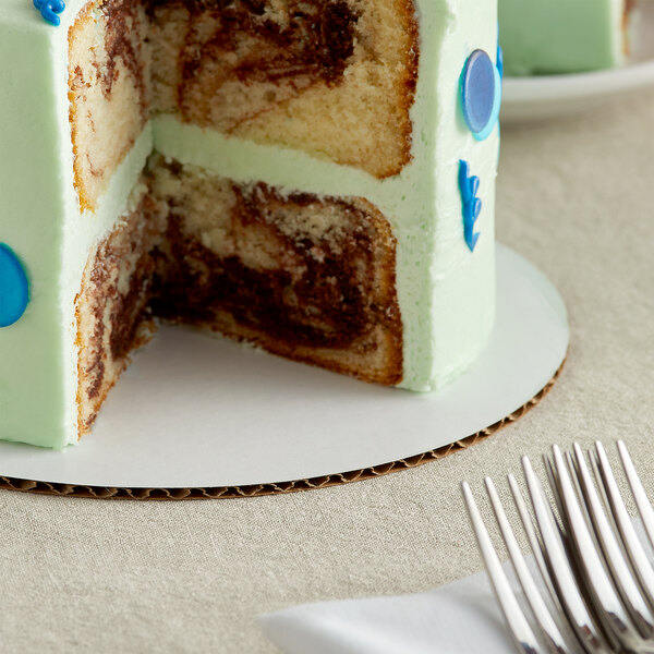 Featuring a wax-coated white side and an uncoated kraft side, this cake circle has a grease-resistant finish that is designed to prevent stains, moisture marks, and residue from transferring onto the board from your buttercream frosting, glazes, or chocolate syrups. It provides a crisp, clean border to your cakes while ensuring a professional presentation for your most elegant of occasions. Plus, you can wipe off any excess icing with ease.